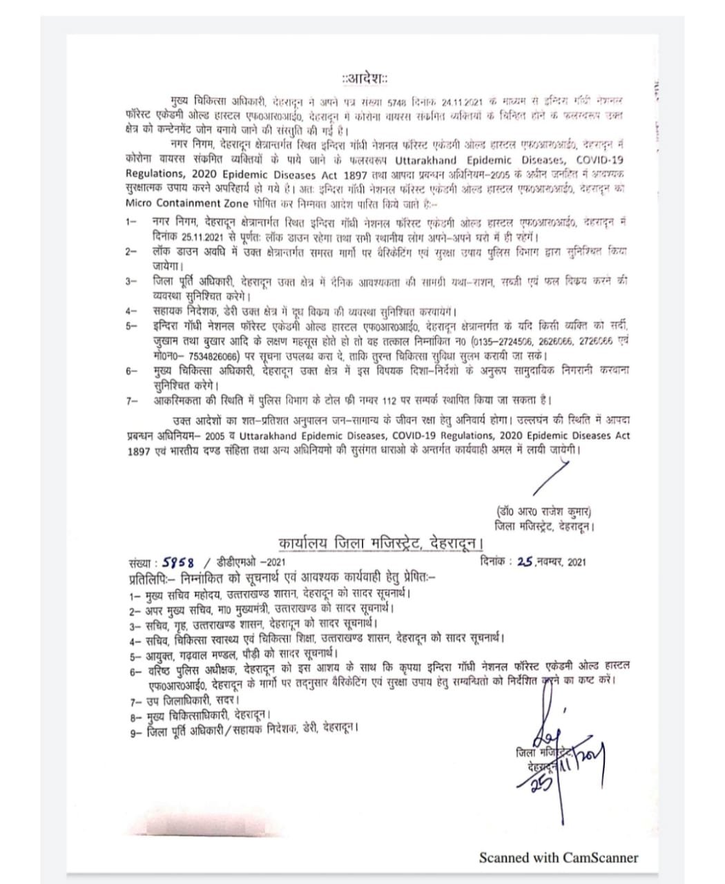 आपको बता दें कि बुधवार को FRI परिसर में 11 आईएफएस अधिकारी कोरोना पॉजिटिव पाए गए थे। जिसके बाद एफ आर आई में कर्फ्यू लागू कर दिया गया है। इसी तरह सहस्रधारा रोड स्थित तिब्बती कॉलोनी डिक्लिन में भी 7 तिब्बती लोग भी कोरोना पॉजिटिव पाए गए थे जिसके बाद यहां भी कोरोना कर्फ्यू लगाया गया है। इस हेतु डीएम ने आदेश जारी किये हैं।
