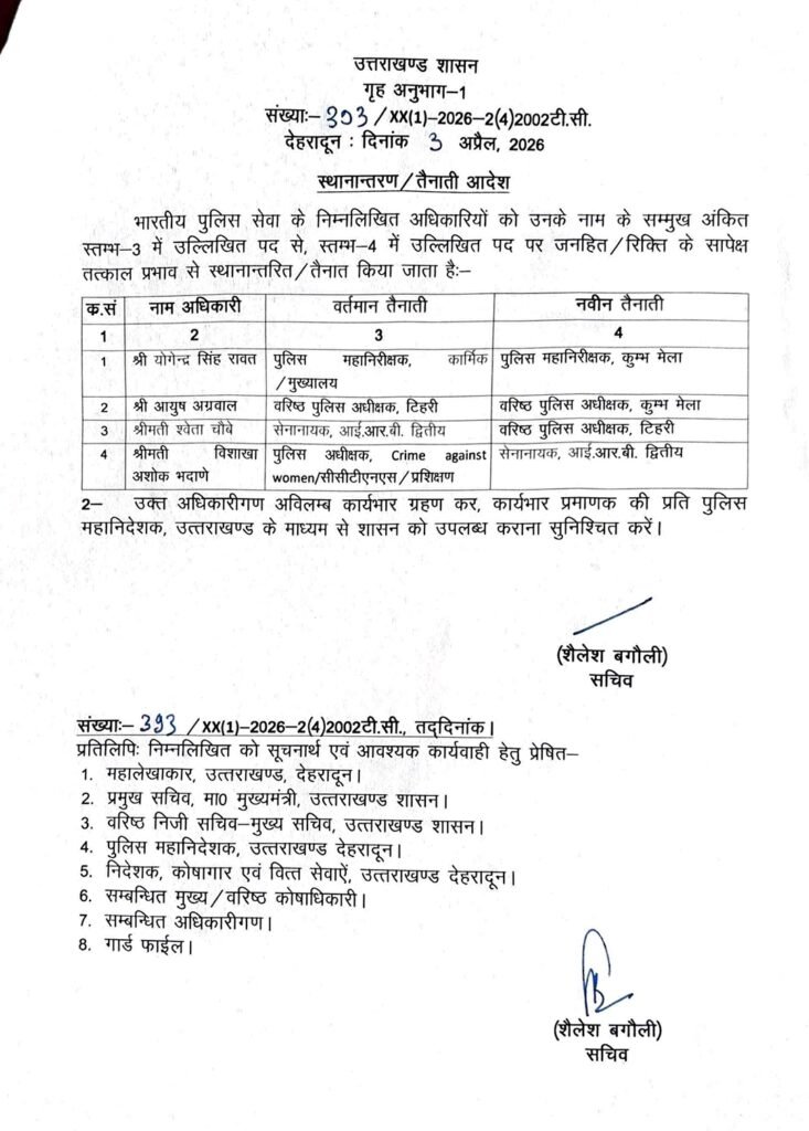 IPS के तबादले: कुंभ मेला के आईजी बनाए गए योगेंद्र रावत, श्वेता चौबे होंगी टिहरी की नई कप्तान