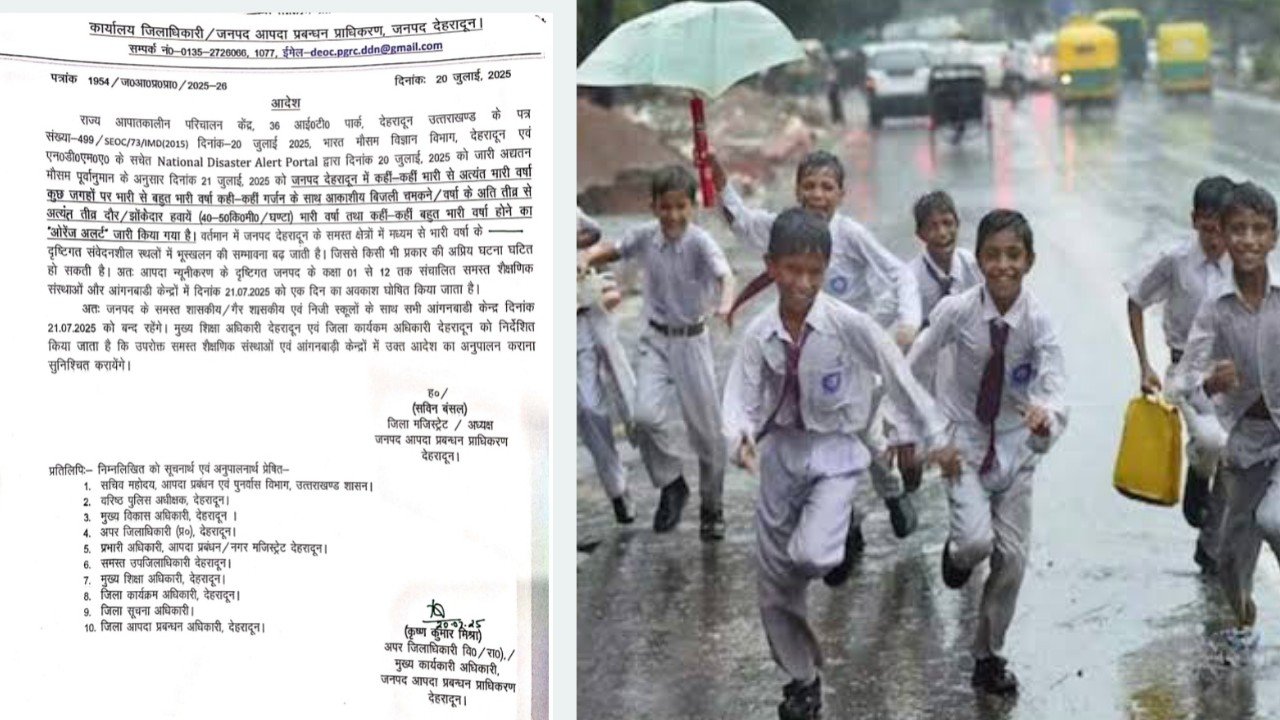 वर्तमान में जनपद देहरादून के समस्त क्षेत्रों में मध्यम से भारी वर्षा के दृष्टिगत संवेदनशील स्थलों में भूस्खलन की सम्भावना बढ़ जाती है। जिससे किसी भी प्रकार की अप्रिय घटना घटित हो सकती है। अतः आपदा न्यूनीकरण के दृष्टिगत जनपद के कक्षा 1 से 12 तक संचालित समस्त शैक्षणिक संस्थाओं और आंगनबाडी केन्द्रों में दिनांक 21.07.2025 को एक दिन का अवकाश घोषित किया जाता है।
