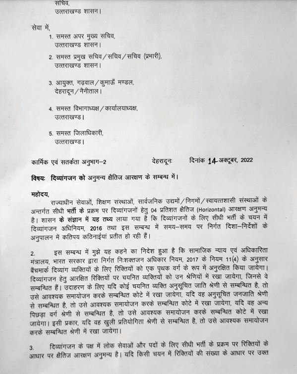 शासन ने दिव्यांगों के लिए सरकारी नौकरियों में आरक्षण पर भी बडा आदेश दिया है। सासन को लगता है कि दिव्यांगों को 4 प्रतिशत आरक्षण देने में कई दिक्कतें आ रही हैं। आदेश के मुताबिक अब दिव्यांग व्यक्तियों के लिए रिक्तियों को एक पृथक वर्ग के रूप में अनुरक्षित किया जायेगा। दिव्यांगजन हेतु आरक्षित रिक्तियों पर चयनित व्यक्तियों को उन श्रेणियों में रखा जायेगा, जिनसे वे सम्बन्धित है। उदाहरण के लिए यदि कोई चयनित व्यक्ति अनुसूचित जाति श्रेणी से सम्बन्धित है, तो उसे आवश्यक समायोजन करके सम्बन्धित कोटे में रखा जायेगा, यदि वह अनुसूचित जनजाति श्रेणी से सम्बन्धित है, तो उसे आवश्यक समायोजन करके सम्बन्धित कोटे में रखा जायेगा, यदि वह अन्य पिछड़ा वर्ग श्रेणी से सम्बन्धित है, तो उसे आवश्यक समायोजन करके सम्बन्धित कोटे में रखा जायेगा। इसी प्रकार यदि वह खुली प्रतियोगिता श्रेणी से सम्बन्धित है, तो उसे आवश्यक समायोजन करके सम्बन्धित श्रेणी में रखा जायेगा।