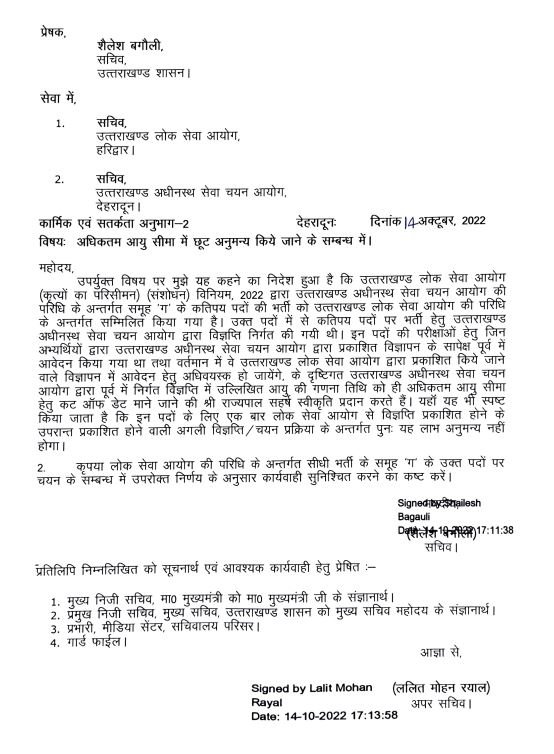 UKSSSC की परीक्षाएं रद्द होने से कई अभयर्थियों के सामने एक और समस्या थी कि वे आवेदन की तय उम्र सीमा के आखिरी वर्ष में थे। ऐसे में नए सिरे से आवेदन करने में उनकी उम्र ज्यादा हो रही थी और वे आवेदन से वंचित रह सकते थे। लेकिन सरकार ने आदेश जारी किया है कि जिन अभ्यर्थियों ने UKSSSC के प्रकाशित विज्ञापन के सापेक्ष पूर्व में आवेदन किया था तथा वर्तमान में वे UKPSC द्वारा प्रकाशित विज्ञापन में आवेदन हेतु अधिवयस्क हो जायेंगे, उकी अधिकतम आयु सीमा की गणना पिछली विज्ञप्ति के आधार पर ही मानी जाएगी। यानी अगर उनकी उम्र अब अगर ज्यादा भी हो, तो भी दोबारा आवेदन के योग्य होंगे।