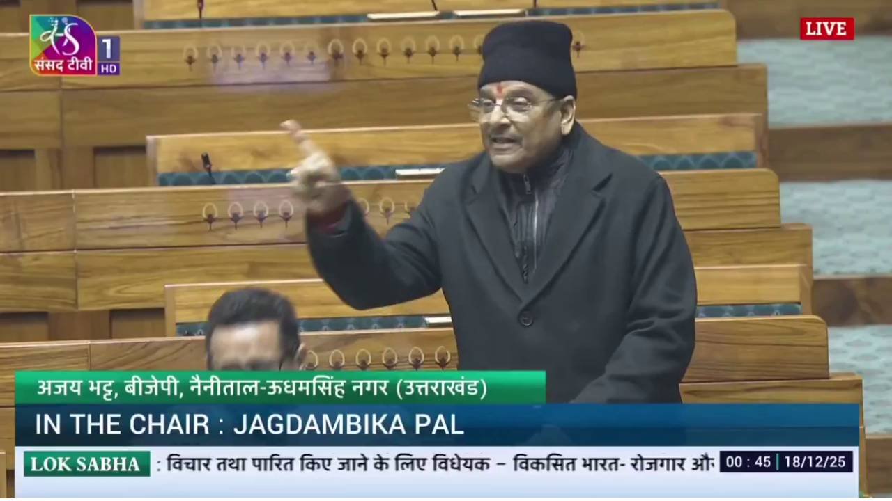 NEW DELHI: संसद के शीतकालीन सत्र में मनरेगा योजना का नाम बदलने को लेकर सियासी घमासान तेज है। मनरेगा की जगह नई नीति लाने और योजना के नाम में बदलाव किए जाने को लेकर विपक्ष, खासकर कांग्रेस, लगातार हमलावर है। कांग्रेस का आरोप है कि नई योजना से महात्मा गांधी का नाम हटाया जा रहा है। इस मुद्दे पर नैनीताल–उधमसिंह नगर लोकसभा सीट से भाजपा सांसद अजय भट्ट ने भी जोरदार तरीके से अपनी बात रखी। उलेकिन इस बीच कही गई उनकी बात सोशल मीडिया पर वायरल हो गई। जिसमें वो कहते हैं कि घर की सारी परेशानी दूर करने के लिए राम नाम जपिए।