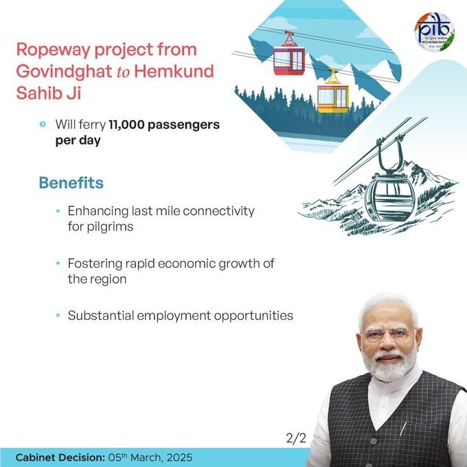 कैबिनेट ने गोविंदघाट से हेमकुंड साहिब तक 12.45 किलोमीटर लंबे रोपवे के लिए भी 2730 करोड रुपए स्वीकृत किए हैं। ये रोपवे दो सेक्शन में बनेगा, पहला गोविंदघाट से घांघरिया तक औऱ दूसरा घांघरिया से हेमकुंड साहिब तक । इस रोपवे के माध्यम से 1100 यात्री प्रति घंटे प्रतिदिन आवाजाही कर सकते हैं। अभी तक गोविंद घाट से हेमकुंड साहिब तक 20 किलोमीटर की ये यात्रा अब रोपवे के माध्यम से महज 42 मिनट में पूरी हो सकेगी।