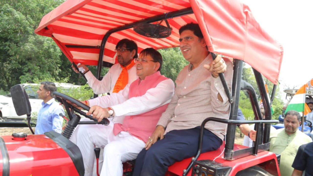सीएम धामी का अनोखा अंदाज, ट्रैक्टर चलाकर किसानों के बीच पहुंचे