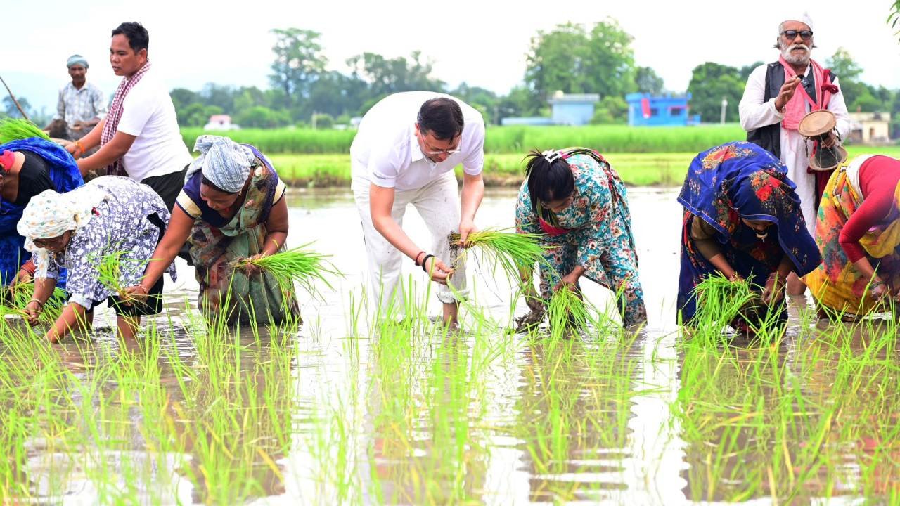 खटीमा में किसानों के बीच दिखा सीएम धामी का अलग अंदाज, खेत जोतकर किसानों के साथ की रोपाई
