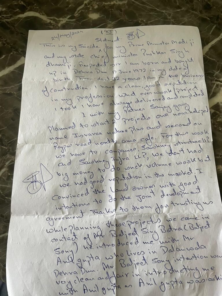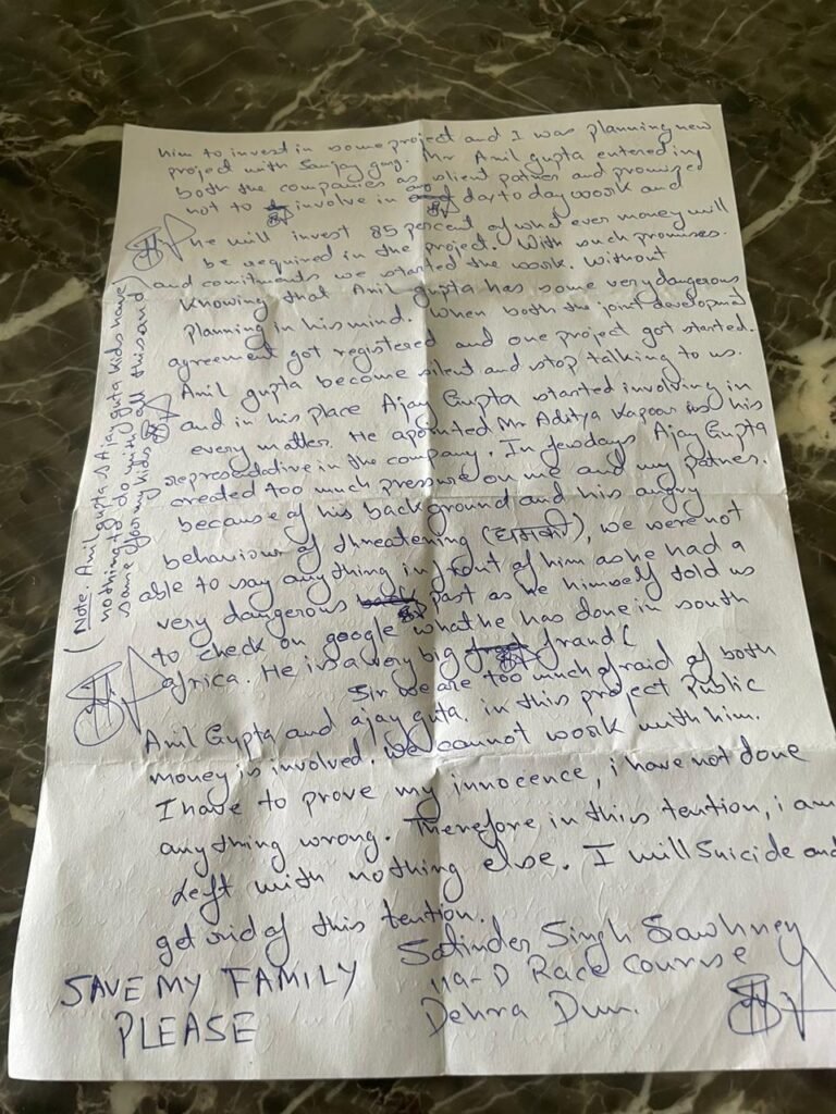 पीएम मोदी और सीएम धामी को संबोधित सुसाइड नोट में साहनी ने लिखा है कि इन दोनों प्रोजेक्ट में जनता का पैसा लगा है, लेकिन गुप्ता बंधुओं के साथ काम करना बहुत मुश्किल है, उके साथ काम नही किया जा सकता. लिहाजा बेनुगाही साबित करने के लिए मेरे पास सुसाइड के अलावा करोई रास्ता नहीं बचा है।