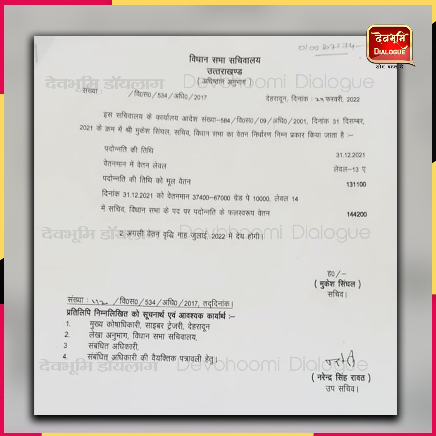 विधानसभा सचिवालय का एक ऐसा ही आदेश देवभूमि डायलॉग के हाथ लगा है। जिसमें एक अधिकारी को एक ही दिन दो अलग अलग पदों पर प्रमोट किया जाता है। 24 फऱवरी 2022 को जारी आदेश के अनुसार विधानसभा सचिवालय में तैनात अपर सचिव मुकेश सिंघल को 31 दिसंबर 2021 को सचिव पद पर प्रमोशन मिलता है। उनका वेतन 1 लाख 31 हजार 100 रुपए होता है। लेकिन इसी आदेश को विस्तार से देखें तो उक्त अधिकारी को सचिव पद पर प्रमोशन देते हुए उसका वेतन एक लाख 44 हजार 200 रुपए कर दिया जाता है। यही नहीं जुलाई 2022 में फिर से इस अधिकारी के लिए वेतन वृद्धि प्रस्तावित है।