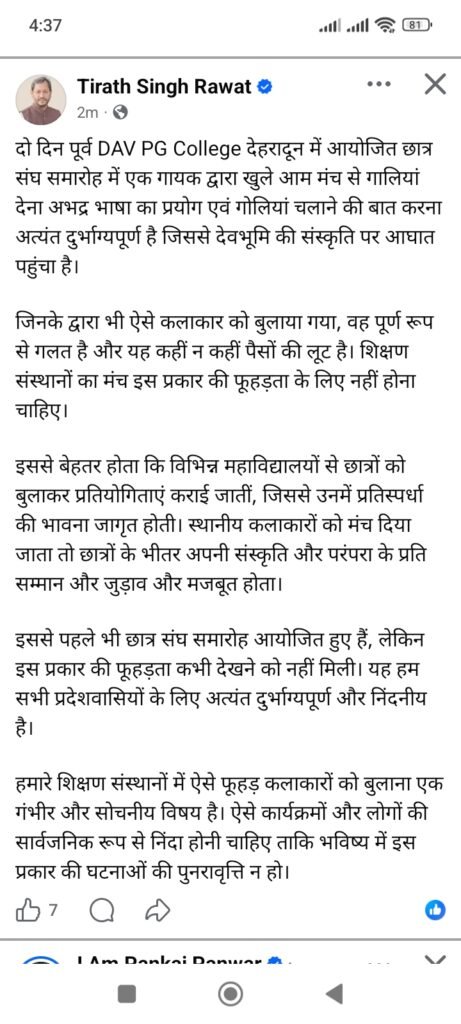 पूर्व सीएम तीरथ ने फेसबुक पर लिखा है, DAV PG College देहरादून में आयोजित छात्र संघ समारोह में एक गायक द्वारा खुले आम मंच से गालियां देना अभद्र भाषा का प्रयोग एवं गोलियां चलाने की बात करना अत्यंत दुर्भाग्यपूर्ण है जिससे देवभूमि की संस्कृति पर आघात पहुंचा है। जिनके द्वारा भी ऐसे कलाकार को बुलाया गया, वह पूर्ण रूप से गलत है और यह कहीं न कहीं पैसों की लूट है। शिक्षण संस्थानों का मंच इस प्रकार की फूहड़ता के लिए नहीं होना चाहिए।