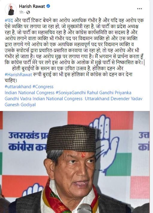 #पद और पार्टी टिकट बेचने का आरोप अत्यधिक गंभीर है और यदि वह आरोप एक ऐसे व्यक्ति पर लगाया जा रहा हो, जो मुख्यमंत्री रहा है, जो पार्टी का प्रदेश अध्यक्ष रहा है, जो पार्टी का महासचिव रहा है और कांग्रेस कार्यसमिति का सदस्य है और आरोप लगाने वाला व्यक्ति भी गंभीर पद पर विद्यमान व्यक्ति हो और उस व्यक्ति द्वारा लगाये गये आरोप को एक अत्यधिक महत्वपूर्ण पद पर विद्यमान व्यक्ति व उसके सपोटर्स द्वारा प्रचारित-प्रसारित करवाया जा रहा हो, तो यह आरोप और भी गंभीर हो जाता है। यह आरोप मुझ पर लगाया गया है। मैं भगवान से प्रार्थना करता हूँ कि कांग्रेस पार्टी मेरे पर लगे इस आरोप के आलोक में मुझे पार्टी से निष्कासित करे।  होली बुराईयों के समन का एक उचित उत्सव है, होलिका दहन और #HarishRawat रूपी बुराई का भी इस होलिका में कांग्रेस को दहन कर देना चाहिए‌।