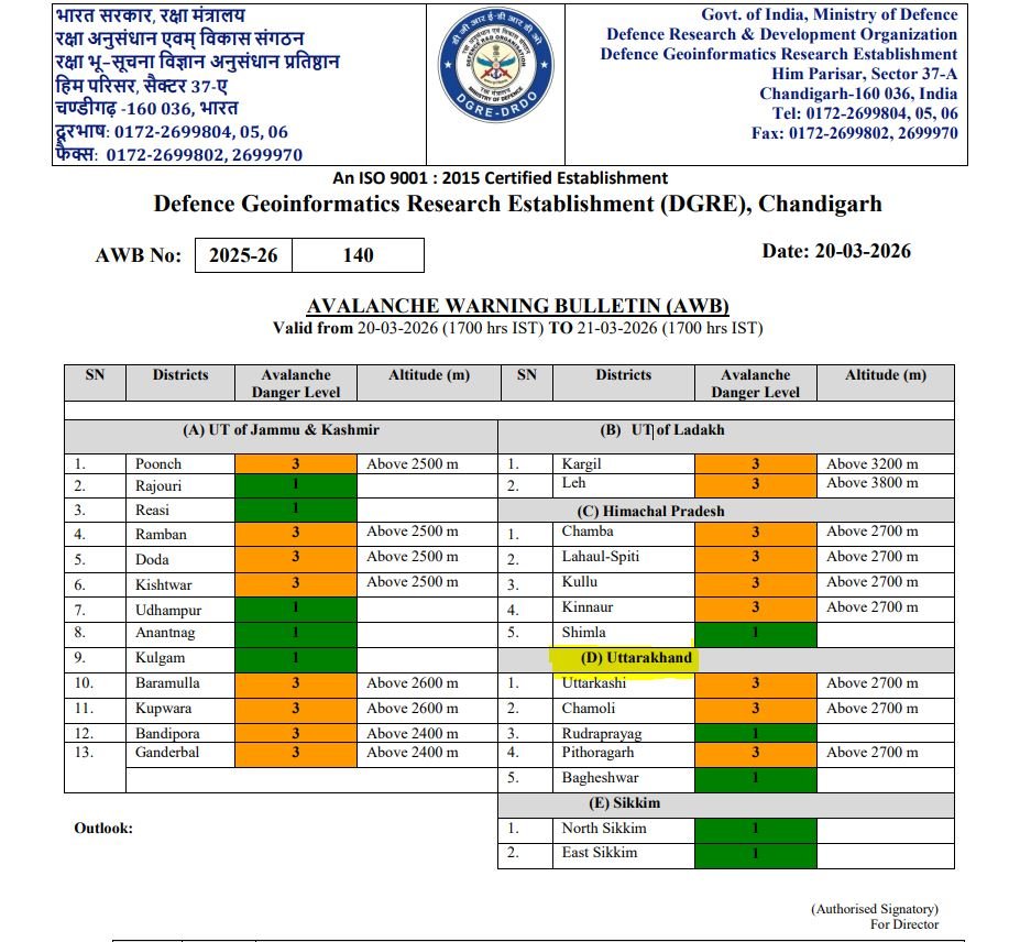 चंडीगढ़ स्थित डिफेंस जियोइनफॉर्मेटिक्स रिसर्च एस्टैब्लिशमेंट (DGRE) द्वारा जारी अलर्ट के मुताबिक 20 मार्च शाम 5 बजे से 21 मार्च शाम 5 बजे तक तीन जिलों पिथौरागढ़, चमोली और उत्तरकाशी में भारी बर्फबारी और हिमस्खलन का अलर्ट जारी किया गया है। इन जिलों को डेंजर लेवल 3 में रखा गया है। सके अलावा रुद्रप्रयाग औऱ बागेश्वर में भी भारी बर्फबारी की संभावना जताई गई है। लेकिन इन्हें डेंजर लेवल 1 में रखा गया है।