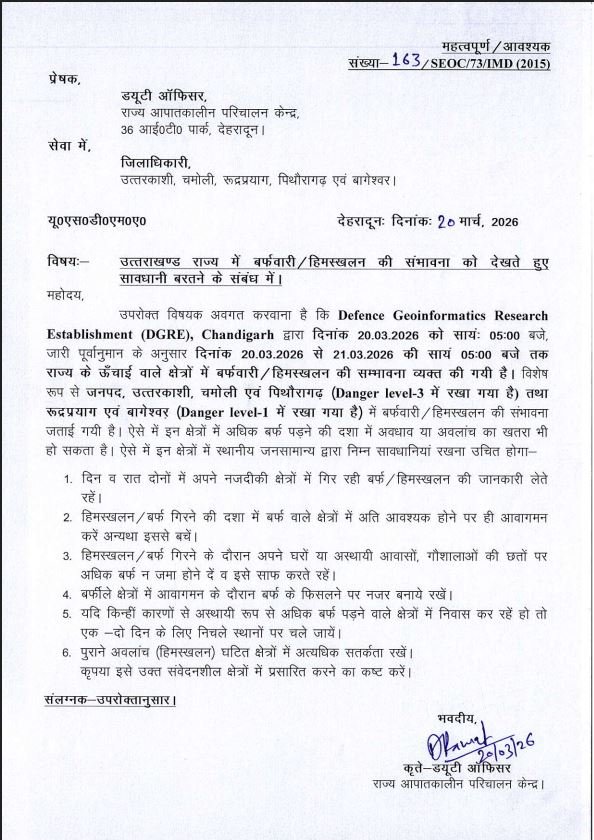 चंडीगढ़ स्थित डिफेंस जियोइनफॉर्मेटिक्स रिसर्च एस्टैब्लिशमेंट (DGRE) द्वारा जारी अलर्ट के मुताबिक 20 मार्च शाम 5 बजे से 21 मार्च शाम 5 बजे तक तीन जिलों पिथौरागढ़, चमोली और उत्तरकाशी में भारी बर्फबारी और हिमस्खलन का अलर्ट जारी किया गया है। इन जिलों को डेंजर लेवल 3 में रखा गया है। सके अलावा रुद्रप्रयाग औऱ बागेश्वर में भी भारी बर्फबारी की संभावना जताई गई है। लेकिन इन्हें डेंजर लेवल 1 में रखा गया है।