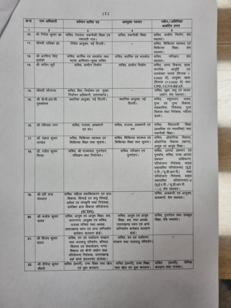 तबादलों पर गौर करें तो मुख्य सचिव एस एस संधू को मुख्य स्थानिक आयुक्त नई दिल्ली की भी जिम्मेदारी दी गई है। राधा रतूड़ी से अपर सचिव ऊर्जा उत्तराखंड परिवहन निगम के अध्यक्ष की जिम्मेदारी ली गई है और उन्हें अपर मुख्य सचिव मुख्यमंत्री, गृह व कारागार विभाग दिए गए हैं। मनीषा पंवार से ग्राम में विकास व कृषि उत्पादन की जिम्मेदारी वापस ली गई है।उन्हें अवस्थापना विकास आयुक्त व अध्यक्ष उत्तराखंड परिवहन निगम की जिम्मेदारी मिली है। आनंद वर्धन से अपर मुख्य सचिव मुख्यमंत्री, वन पर्यावरण संरक्षण, जलवायु परिवर्तन की जिम्मेदारी लेकर अपर मुख्य सचिव ग्रामीण विकास राजस्व शहरी विकास आवास मुख्य प्रशासक उत्तराखंड आवास और नगर विकास प्राधिकरण का जिम्मा दिया है। आरके सुधांशु को प्रमुख सचिव वन पर्यावरण व संरक्षण की जिम्मेदारी दी गई प्रमुख सचिव ग्रह व कारागार हटाया गया एल फनाई से प्रमुख सचिव सैनिक कल्याण विभाग लिया गया वापस आयुक्त समाज कल्याण दिया गया।
