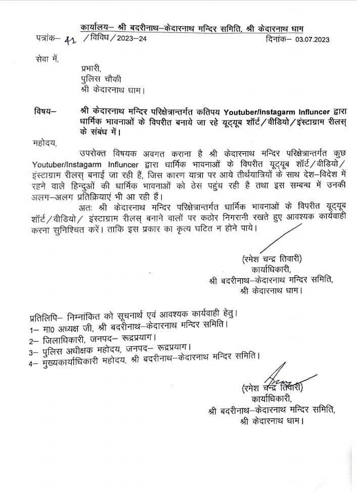 केदारनाथ धाम में तरह तरह के वीडियो वायरल होने के बाद बद्रीनाथ केदारनाथ मंदिर समिति ने पुलिस को लिखित में रूप में कहा था कि ऐसे वीडियो पर कड़ी नजर रखी जाए। जिसके बाद एसएसपी विशाखा भदाणे का कहना है कि इस प्रकार के वीडियो बनाने वालों पर नजर रखी जा रही है। पुलिस पहले से ही ऑपरेशन मर्यादा के तहत इस प्रकार के वीडियो बनाने वालों के खिलाफ कार्रवाई कर रही है।