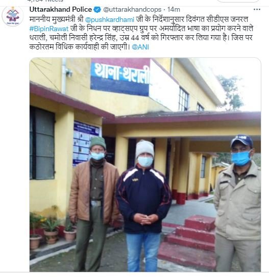उत्तराखंड पुलिस ने जानकारी दी है कि मुख्यमंत्री पुष्कर धामी के निर्देशों के क्रम में यह कार्रवाई की गई है। थराली निवासी 44 वर्षीय हरेंद्र सिंह को वट्सएप्प में जनरल बिपिन रावत के बारे में अमर्यादित टिप्पणी करने के लिए गिरफ्तार किया गया है। आरोपी के खिलाफ कठोरतम विधिक कार्यवाही की जाएगी।