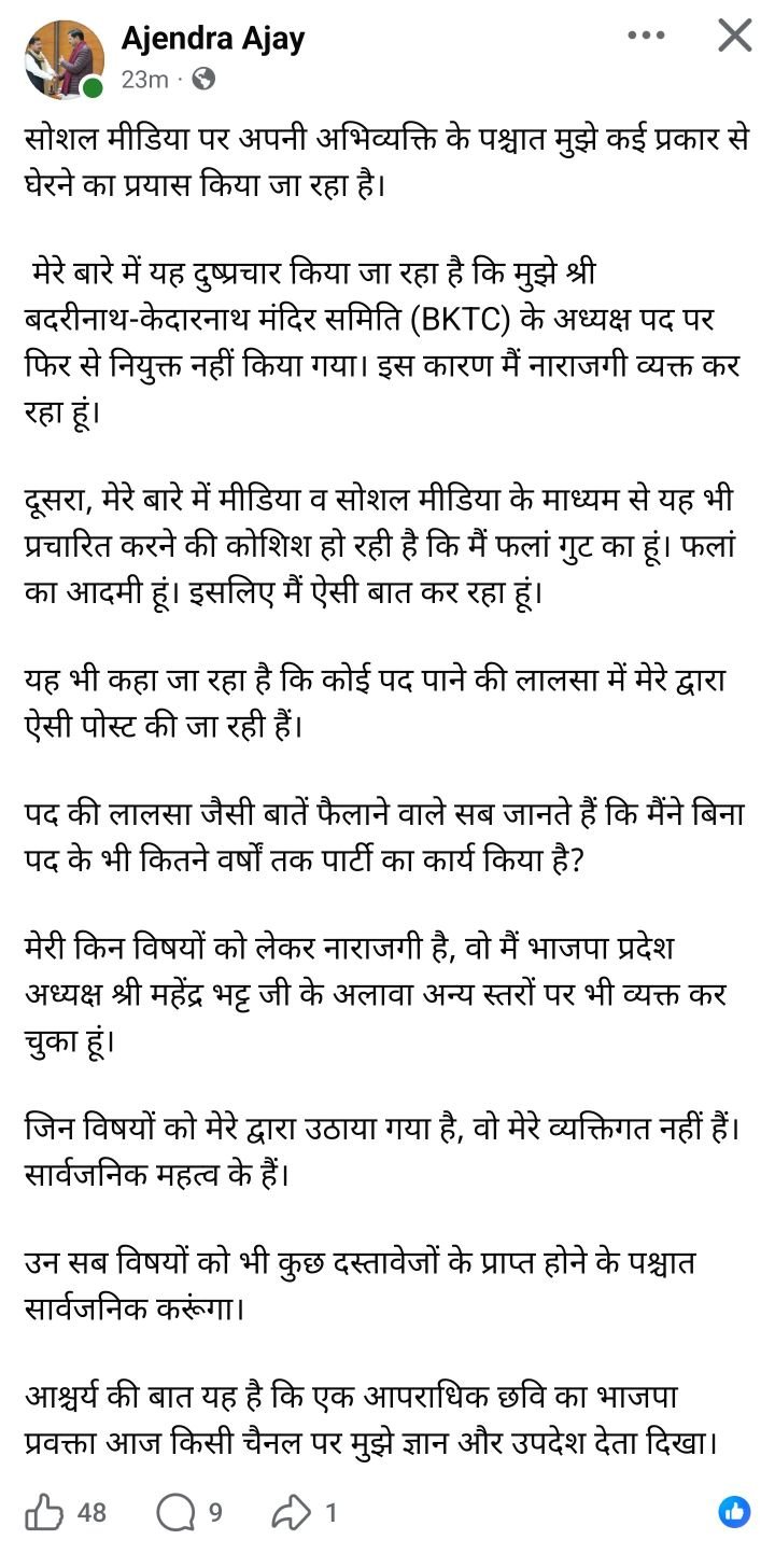 अजेंद्र अजय ने फेसबुक पर लिखा कि ‘सोशल मीडिया पर अपनी अभिव्यक्ति के पश्चात मुझे कई प्रकार से घेरने का प्रयास किया जा रहा है। मेरे बारे में यह दुष्प्रचार किया जा रहा है कि मुझे बदरीनाथ-केदारनाथ मंदिर समिति (BKTC) के अध्यक्ष पद पर फिर से नियुक्त नहीं किया गया। इस कारण मैं नाराजगी व्यक्त कर रहा हूं’…। ‘दूसरा, मेरे बारे में मीडिया व सोशल मीडिया के माध्यम से यह भी प्रचारित करने की कोशिश हो रही है कि मैं फलां गुट का हूं। फलां का आदमी हूं। इसलिए मैं ऐसी बात कर रहा हूं। यह भी कहा जा रहा है कि कोई पद पाने की लालसा में मेरे द्वारा ऐसी पोस्ट की जा रही हैं। पद की लालसा जैसी बातें फैलाने वाले सब जानते हैं कि मैंने बिना पद के भी कितने वर्षों तक पार्टी का कार्य किया है’?