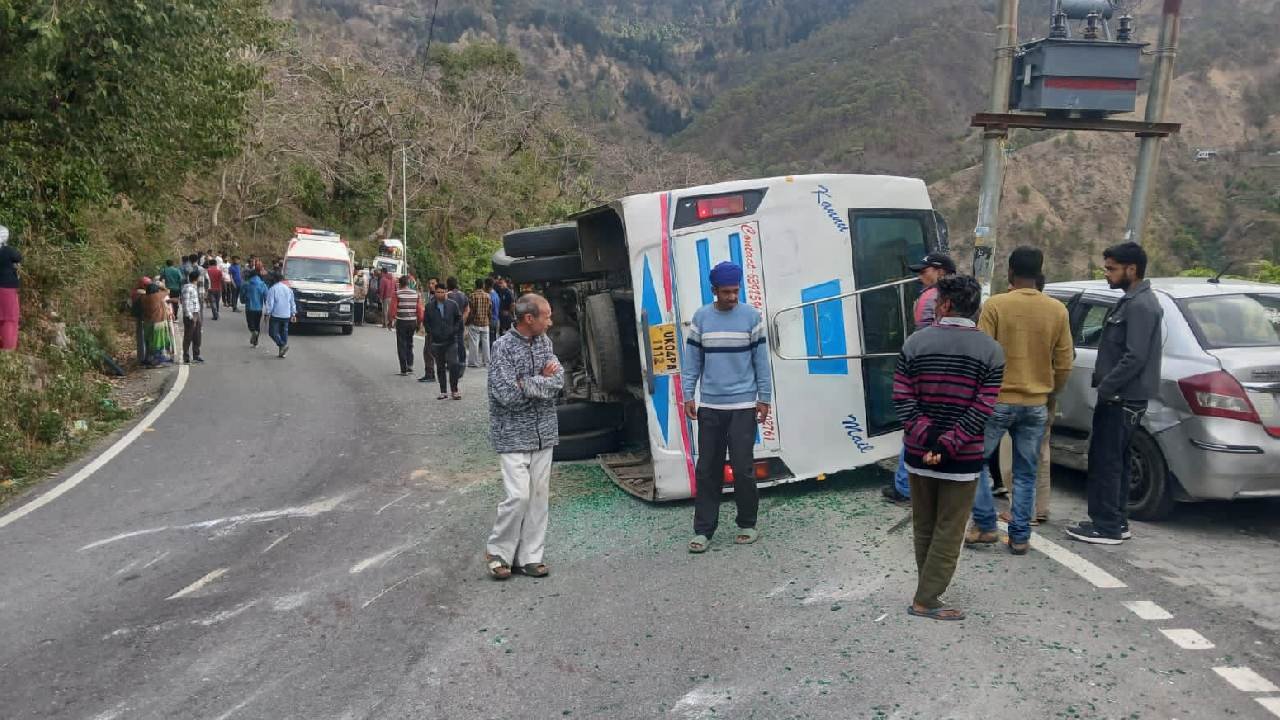 भवाली मार्ग पर हादसा, तेज रफ्तार केमू बस सड़क पर पलटी, एक की मौत, 8 घायल