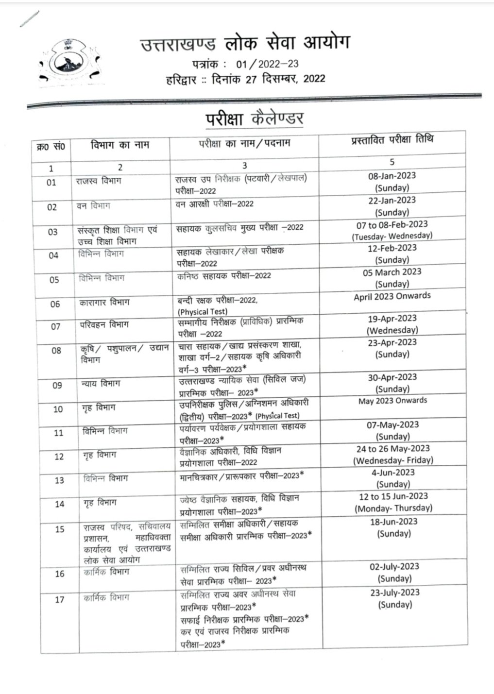 Dehradun: प्रतियोगी परीक्षाओं की तैयारी कर रहे युवाओं के लिए खुशखबरी है। नए साल में एक के बाद एक 32 परीक्षाओं की तारीखों का ऐलान हो गया है। उत्तराखंड लोकसेवा आयोग ने 32 परीक्षाओं के लिए कलेंडर जारी कर दिया है। नए साल में आयोग 5700 पदों पर नई भर्तियां भी निकालेगा। अभ्यर्थियों की सुविधार्थ परीक्षा कलेण्डर को आयोग की वेबसाईट www.psc.uk.gov.in पर अपलोड किया गया है।