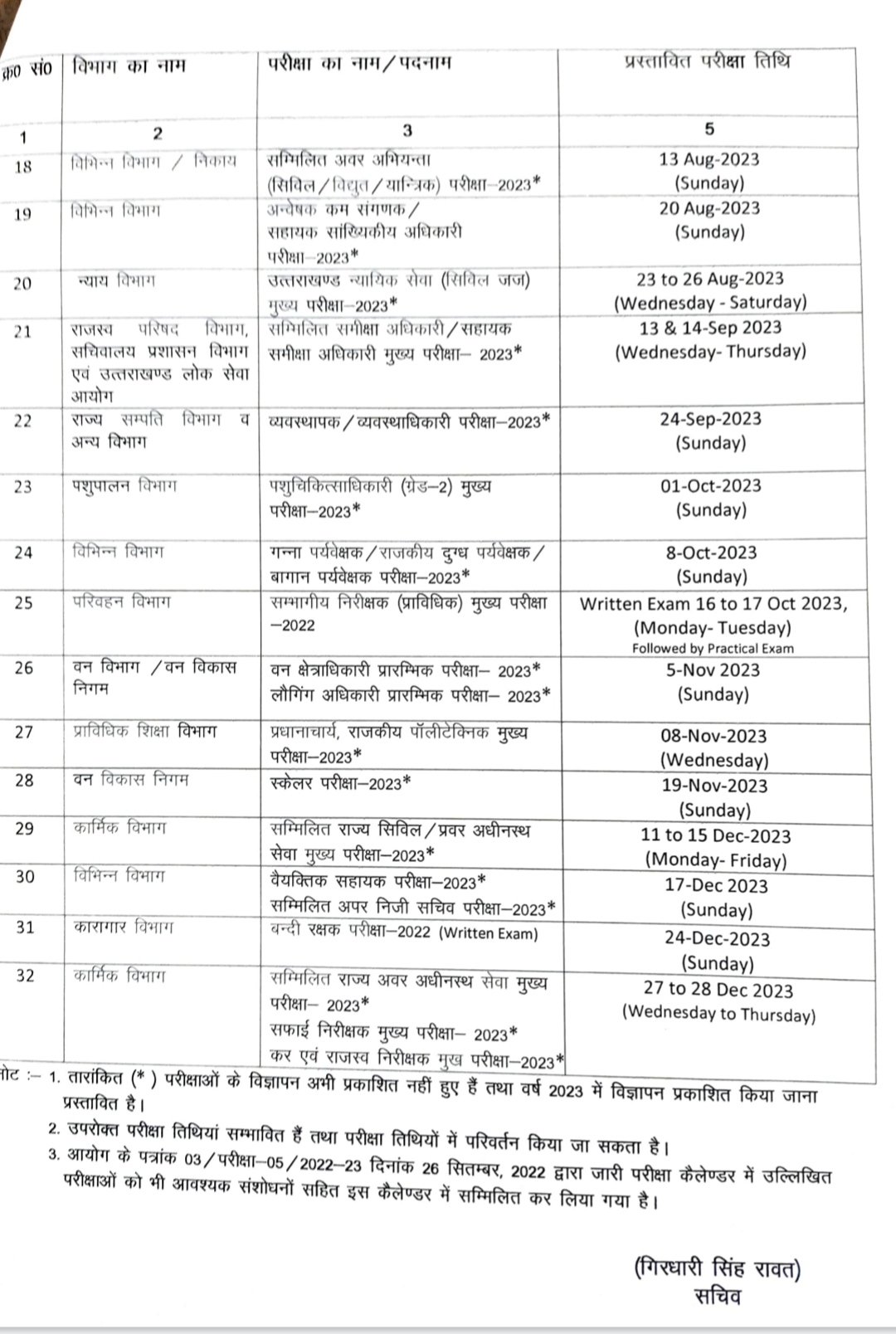 वार्षिक परीक्षा कलेण्डर के बारे में विस्तृत जानकारी देते हुए डॉ० राकेश कुमार द्वारा अवगत कराया है कि शासन से प्राप्त विभिन्न अधियाचनों को समरूपता के आधार पर संयोजित करते हुए कुल 32 परीक्षाओं हेतु परीक्षा कलेण्डर जारी किया गया है। इसके अन्तर्गत शासन से प्राप्त यूकेएसएसएससी की कुल 15 परीक्षाओं को भी परीक्षा कलेण्डर में शामिल किया गया है तथा उत्तराखण्ड लोक सेवा आयोग की महत्वपूर्ण परीक्षाओं यथा- पी०सी०एस० परीक्षा 2023 लोवर पी०सी०एस० परीक्षा-2023 सिविल जज जू.डि. परीक्षा 2023 आर०ओ० / ए०आर०ओ० परीक्षा- 2023 एवं जे०ई० परीक्षा 2023 वन क्षेत्राधिकारी परीक्षा -2023, ए०पी०एस० परीक्षा 2023 आदि के संदर्भ में आयोग द्वारा अग्रेतर कार्यवाही प्रारम्भ की जा रही है तथा लगभग 5700 रिक्त पदों हेतु रिक्ति विज्ञापन जारी किये जायेंगे। इसी क्रम में डॉ० कुमार द्वारा यह भी जानकारी दी गई है कि आरक्षण से सम्बन्धित उत्पन्न कतिपय विसंगतियों के निस्तारण हेतु प्रत्यावर्तित अधियाचनों को संशोधित किये जाने की कार्यवाही शासन स्तर पर गतिमान है, उक्त अधियाचनों का आयोग को यथासमय प्राप्त होना अपेक्षित है।