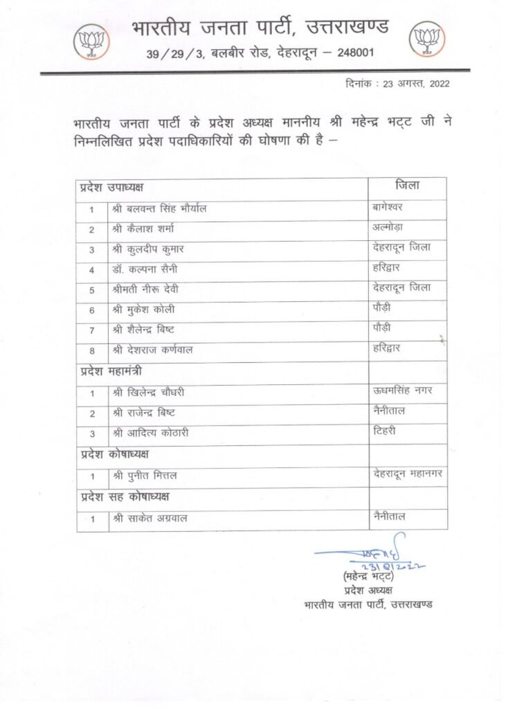 महेंद्र भट्ट ने अपनी टीम में आठ प्रदेश मंत्री, तीन प्रदेश महामंत्री और आठ प्रदेश उपाध्यक्ष को जगह दी है। नई टीम में तीनों महामंत्री बदल दिए गए हैं। खिलेंद्र चौधरी, राजेंद्र बिष्ट और आदित्य कोठारी को महामंत्री बनाया गया है। महामंत्री रह चुके कुलदीप कुमार समेत 8 उपाध्यक्ष बनाए गए हैं। उपाध्यक्ष बनाया गया है। जिन पूर्व विधायकों के 2022 के चुनाव में टिकट काटे गए थे उनमें से बलवंत सिंह भौर्याल, मुकेश कोली, देशराज कर्णवाल को भी उपाध्यक्ष बनाया गया है।