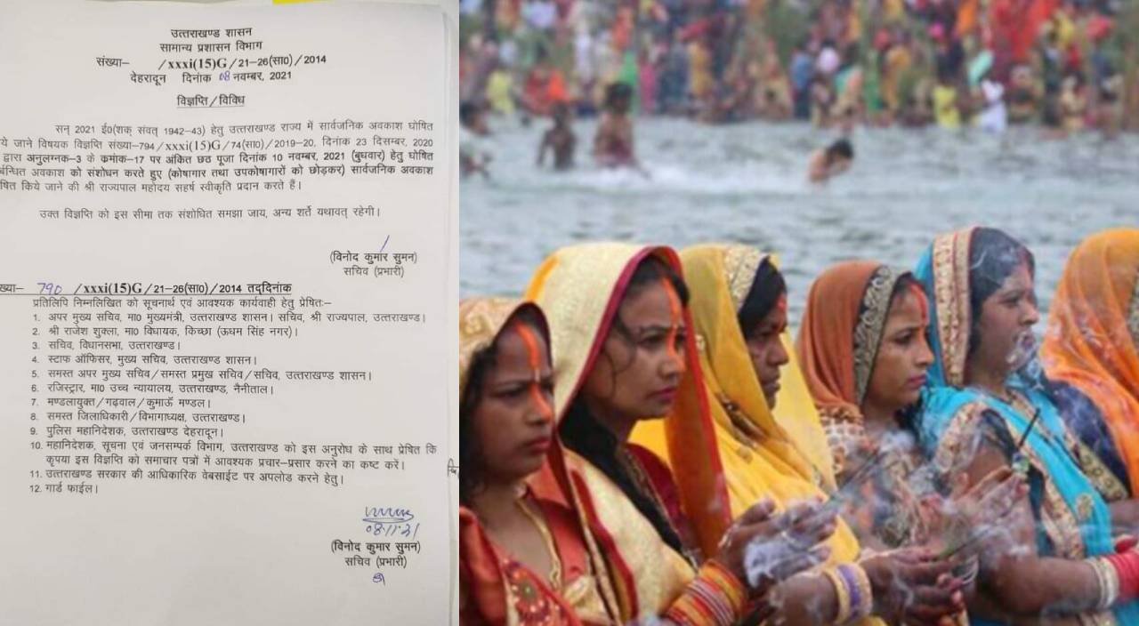 शासन द्वारा जारी आदेश में लिखा गया है, छठ पूजा को लेकर अवकाश के आदेश जारी कर दिए हैं हेतु उत्तराखण्ड राज्य में सार्वजनिक अवकाश घोषित किये जाने विषयक विज्ञप्ति संख्या-794 / xxx i ( 15 ) G / 74 ( सा0 ) / 2019-20 दिनांक 23 दिसम्बर, 2020 के द्वारा अनुलग्नक-3 के कमांक-17 पर अंकित छठ पूजा दिनांक 10 नवम्बर, 2021 (बुधवार) हेतु घोषित निर्बन्धित अवकाश को संशोधन करते हुए (कोषागार तथा उपकोषागारों को छोड़कर) सार्वजनिक अवकाश घोषित किये जाने की राज्यपाल महोदय सहर्ष स्वीकृति प्रदान करते हैं।