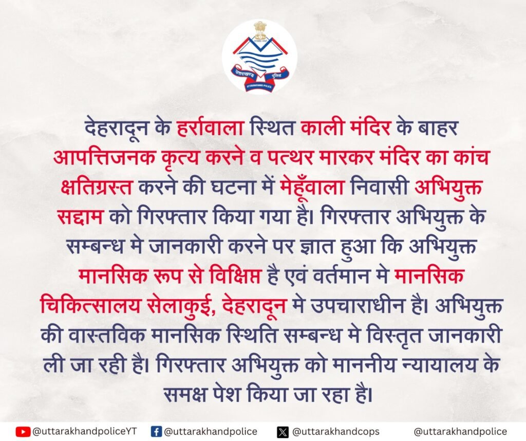 DEHRADUN: देहरादून के हर्रावाला में काली मंदिर के गेट पर पेशाब करने और ईंट से शीशा तोड़ने के आरोपी को पुलिस ने गिरफ्तार कर लिया है। आरोपी सद्दाम को मेहूंवाला से गिरफ्तार किया गया है। पुलिस के अनुसार आरोपी मानसिक रूप से विक्षिप्त है और उसका सेलाकुईं के मानसिक चिकित्सालय में इलाज चल रहा है।